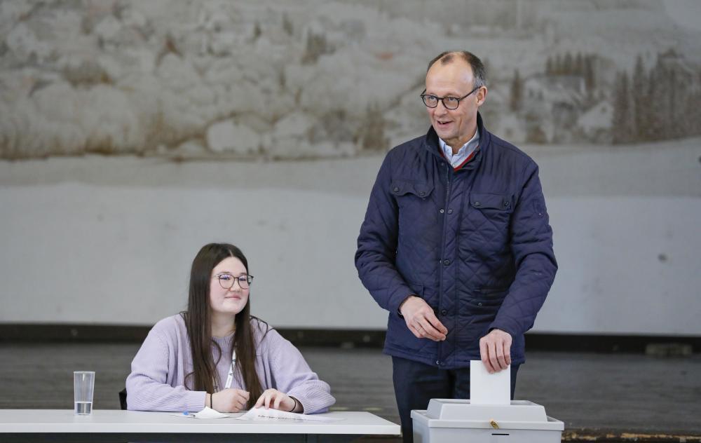 tttttttttttt2月23日,在德国北莱茵-威斯特法伦州阿恩斯贝格,德国联盟党总理候选人默茨在一处投票站投票。新华社记者 张帆 摄tttttt
